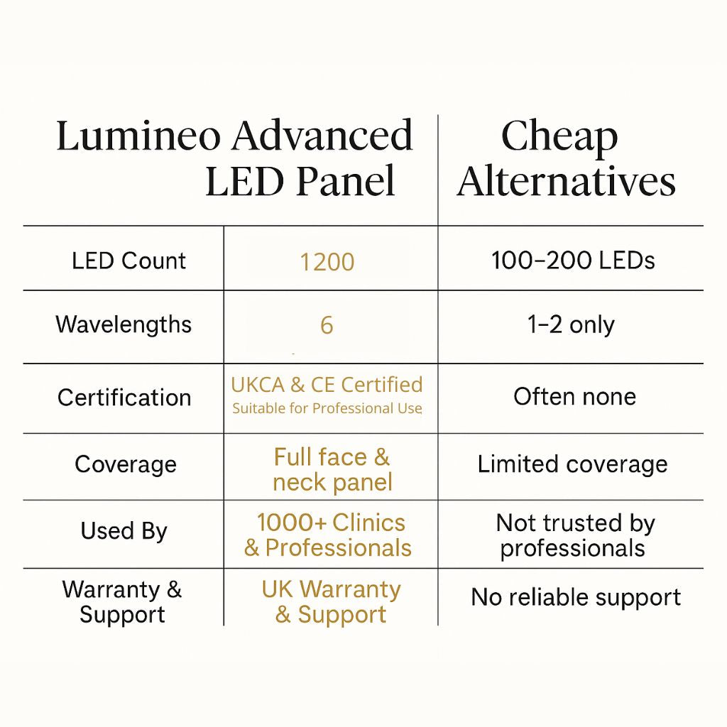Professional machines like Lumineo use higher power, multiple wavelengths, and cover larger treatment areas, which means faster, more effective results for clients.